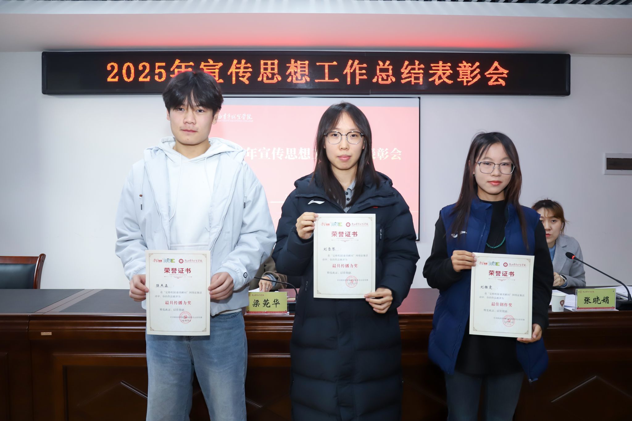 12月29日,学校2025年宣传思想工作总结表彰会在长安校区召开。党委副书记梁菀华出席,宣传部部长张晓娟主持,各系(院)、各部门有关负责人、信息联络员(网评员)、学生代表及宣传部全体人员参加。